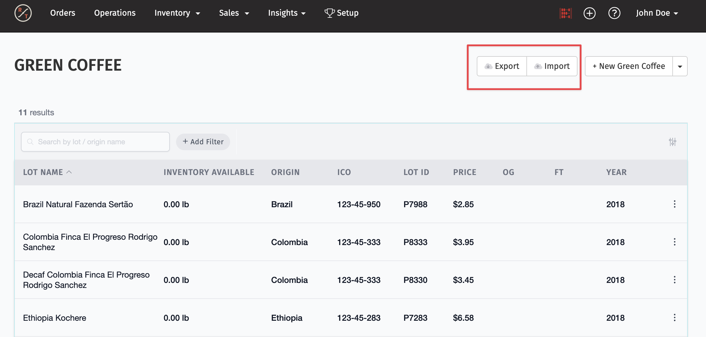 - Click the Export button to download a CSV file of your green coffees