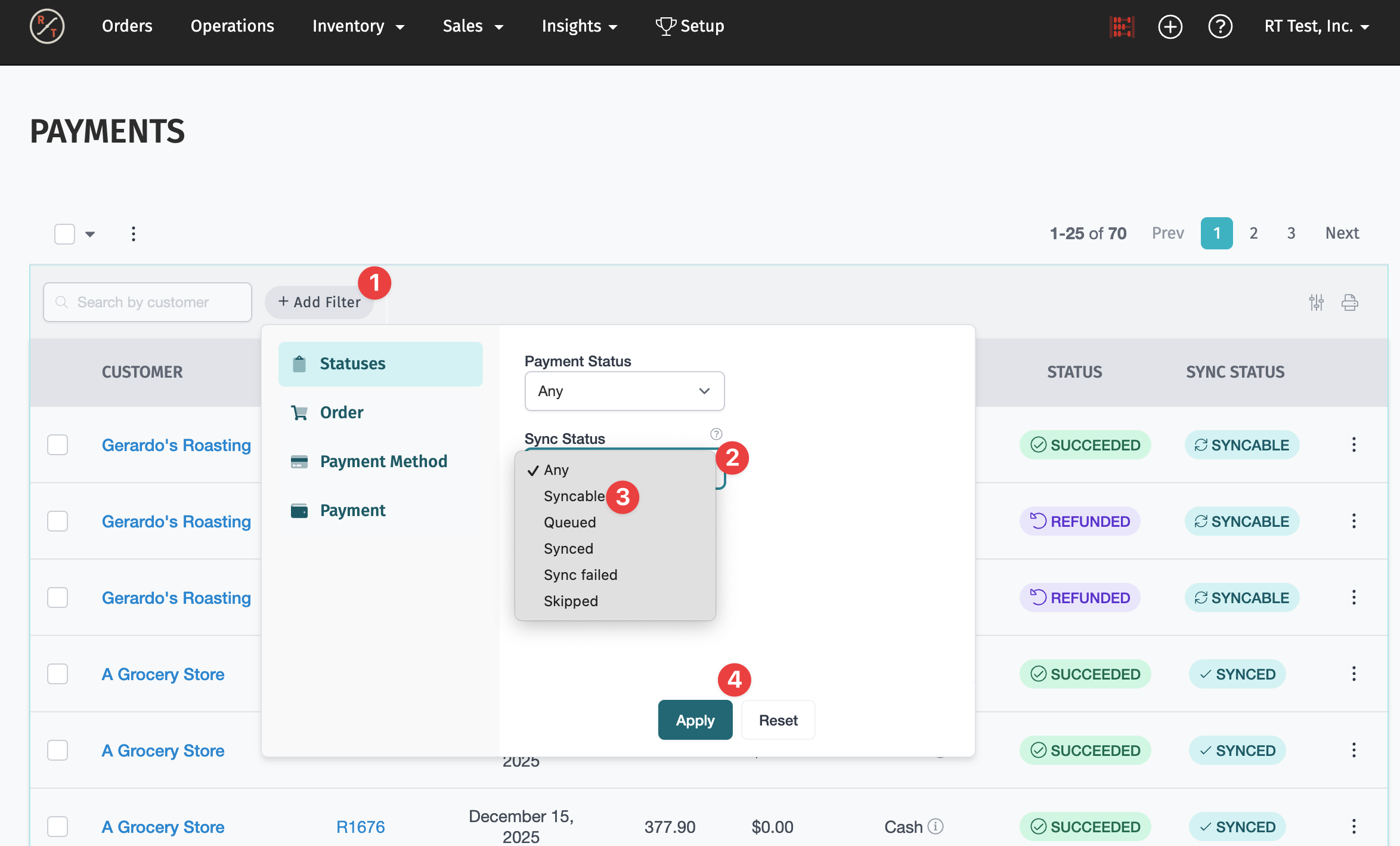 You can use the filters to view the orders with payments ready to be synced. On the Payments page: