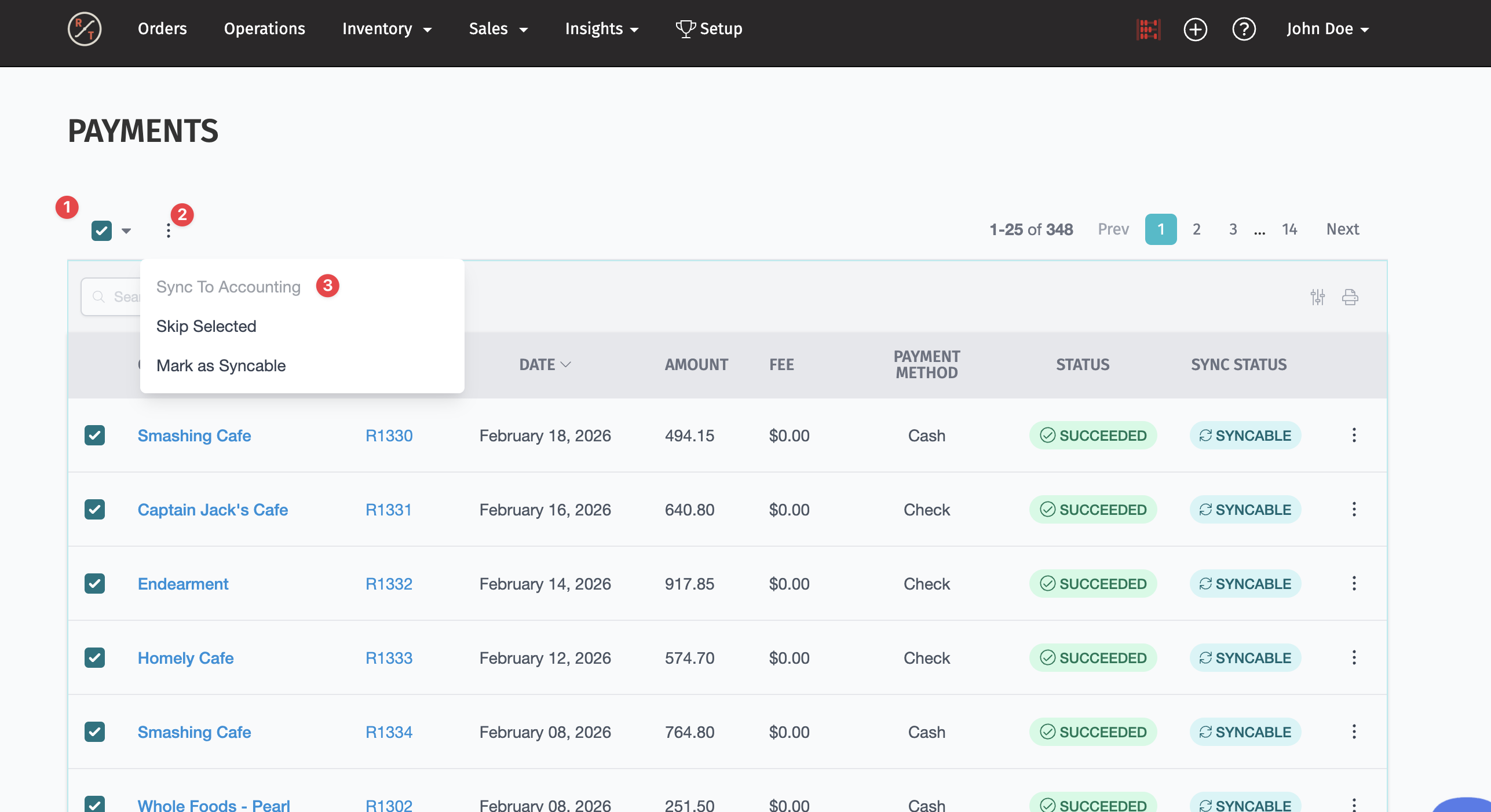 Once you've selected the payments, select the three dots and then choose "Sync to Accounting"