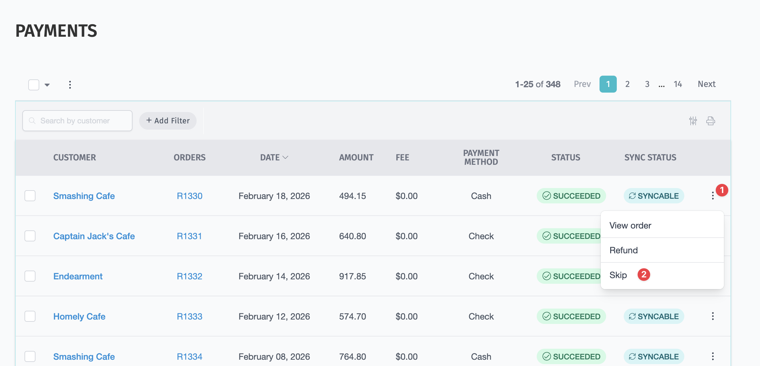 Tip: To find all payments ready to sync, filter by Sync Status: Syncable. This shows only payments that haven’t been synced or skipped. You can also search by customer name using the search bar.