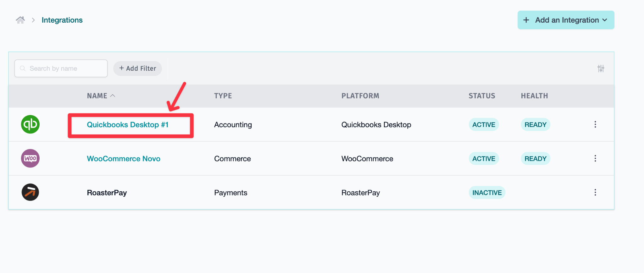 - Go to your profile/name > integrations > Click on the name of your accounting integration