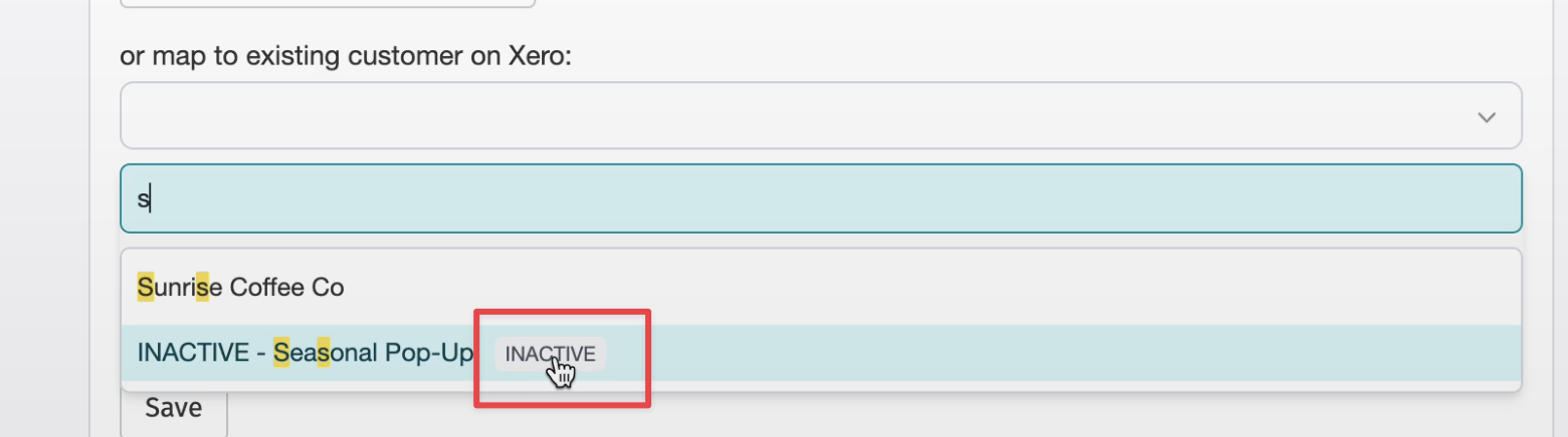When mapping Customer or Variants to your accounting platform, you can now see which records are inactive in your accounting platform. An "INACTIVE" badge appears next to any inactive/archived items in the dropdown, so you won't accidentally map to something that will cause sync failures.
