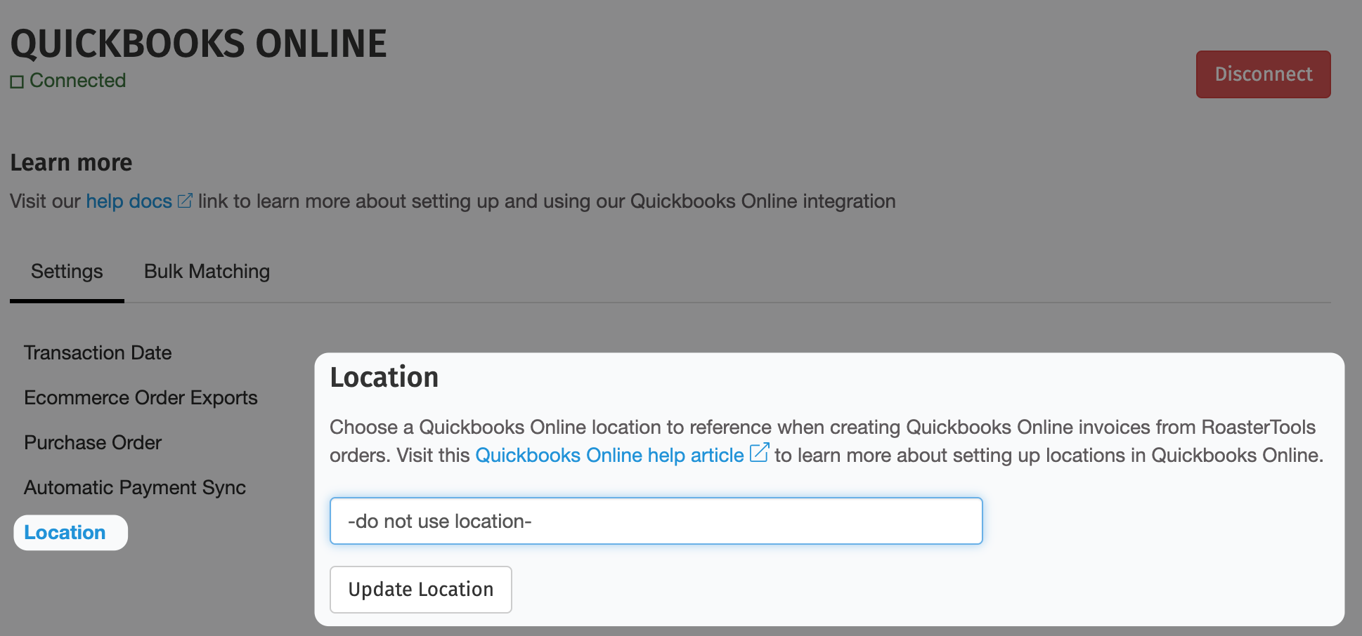 Select the QuickBooks Online integration, then select Location.