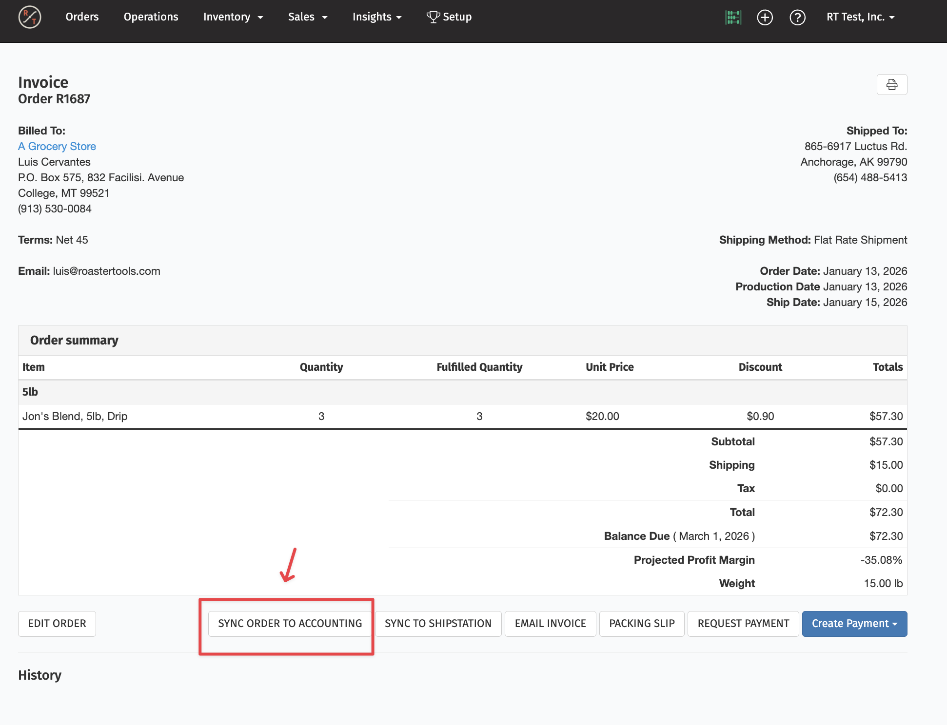 Reminder: If the order is marked as paid when you sync it, RoasterTools will also create the payment in your accounting platform. You won’t need to sync the payment separately.