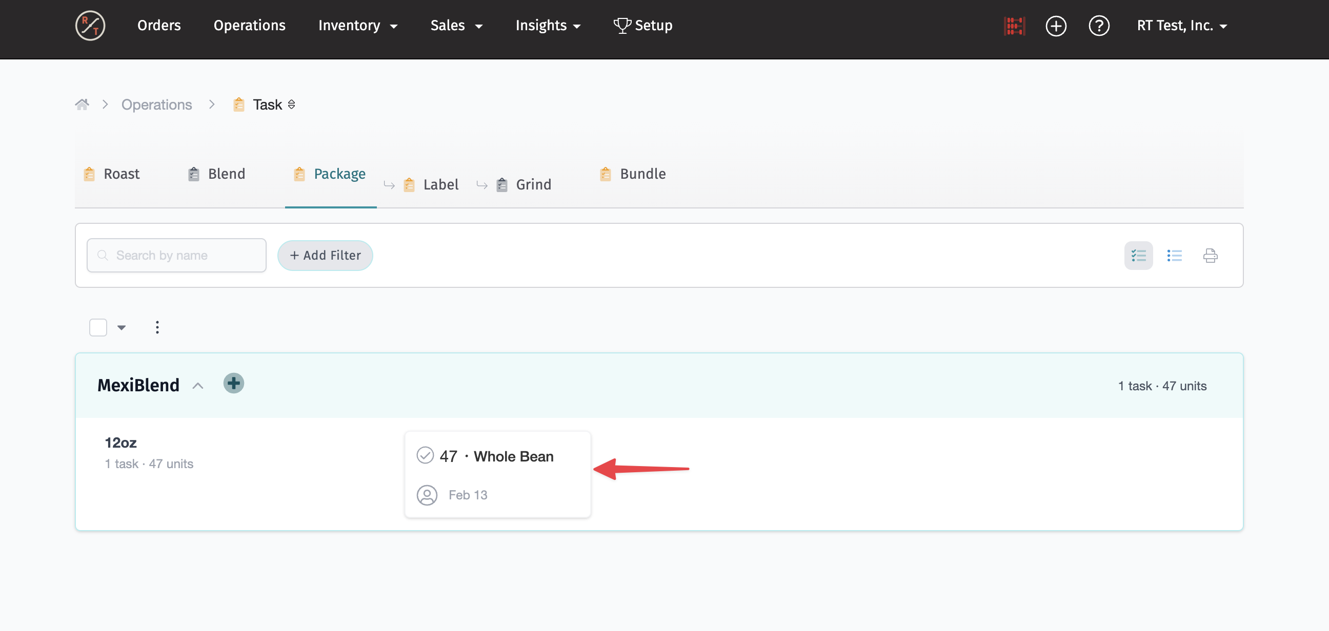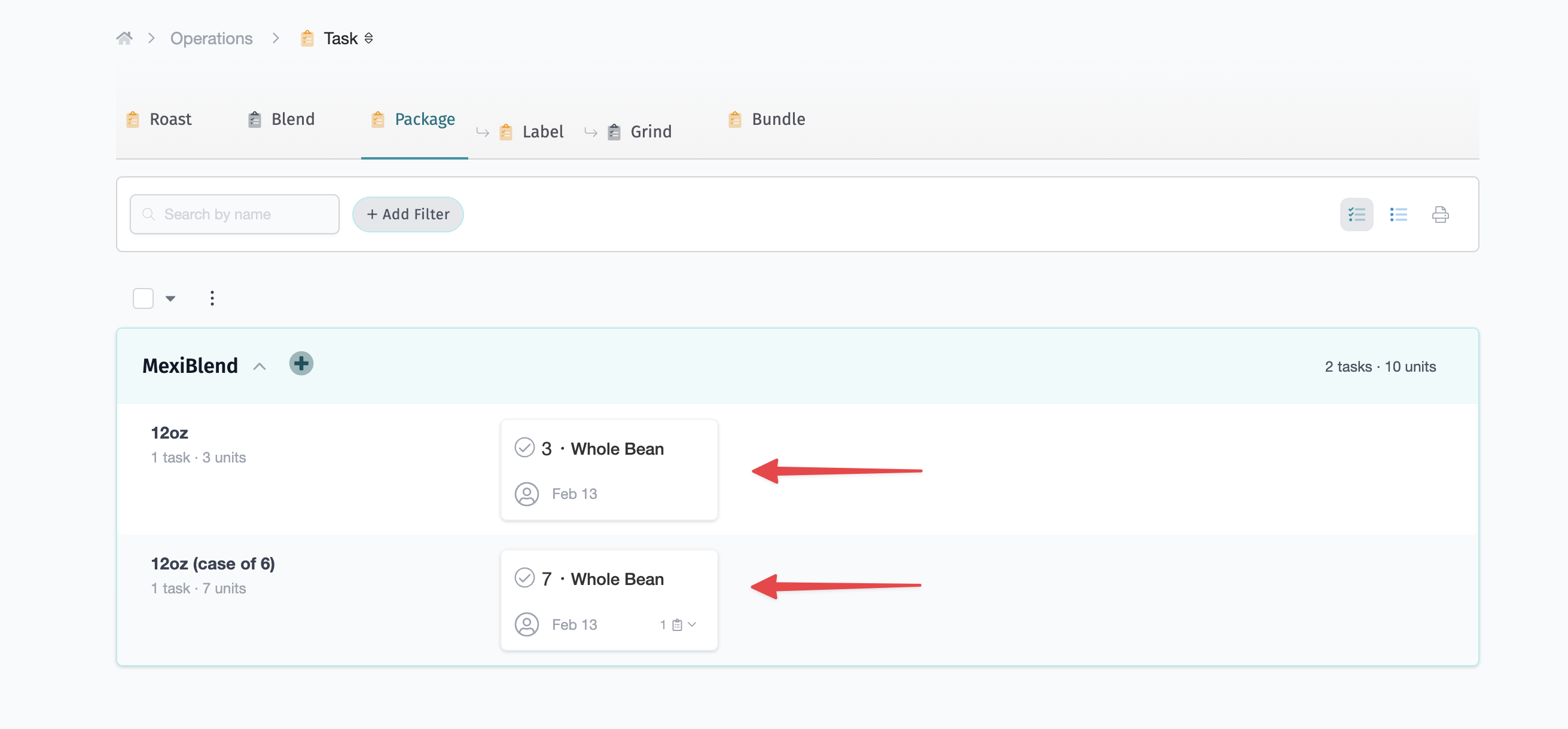 - Your packaging tasks show the case quantity separately from individual bags (e.g., "7 cases of 6" and "3 individual 12oz bags").