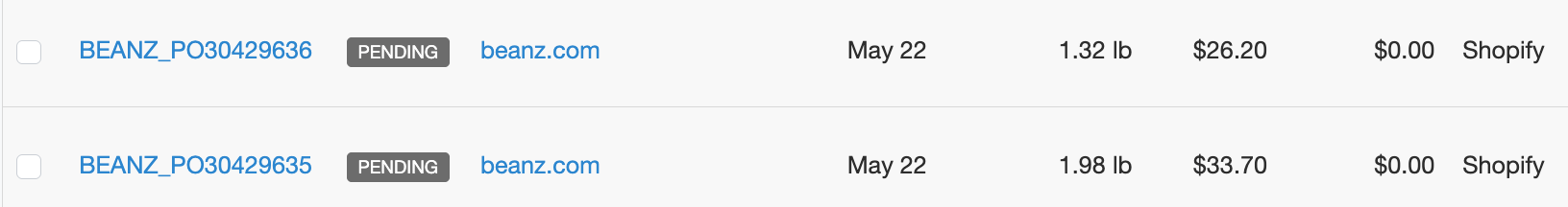 If your Beanz account is connected to Shopify, orders can flow into RoasterTools automatically through the Shopify commerce connection. Once Beanz orders are imported into Shopify, you can easily import the orders into RoasterTools. Orders appear on your Orders page just like any other Shopify order.