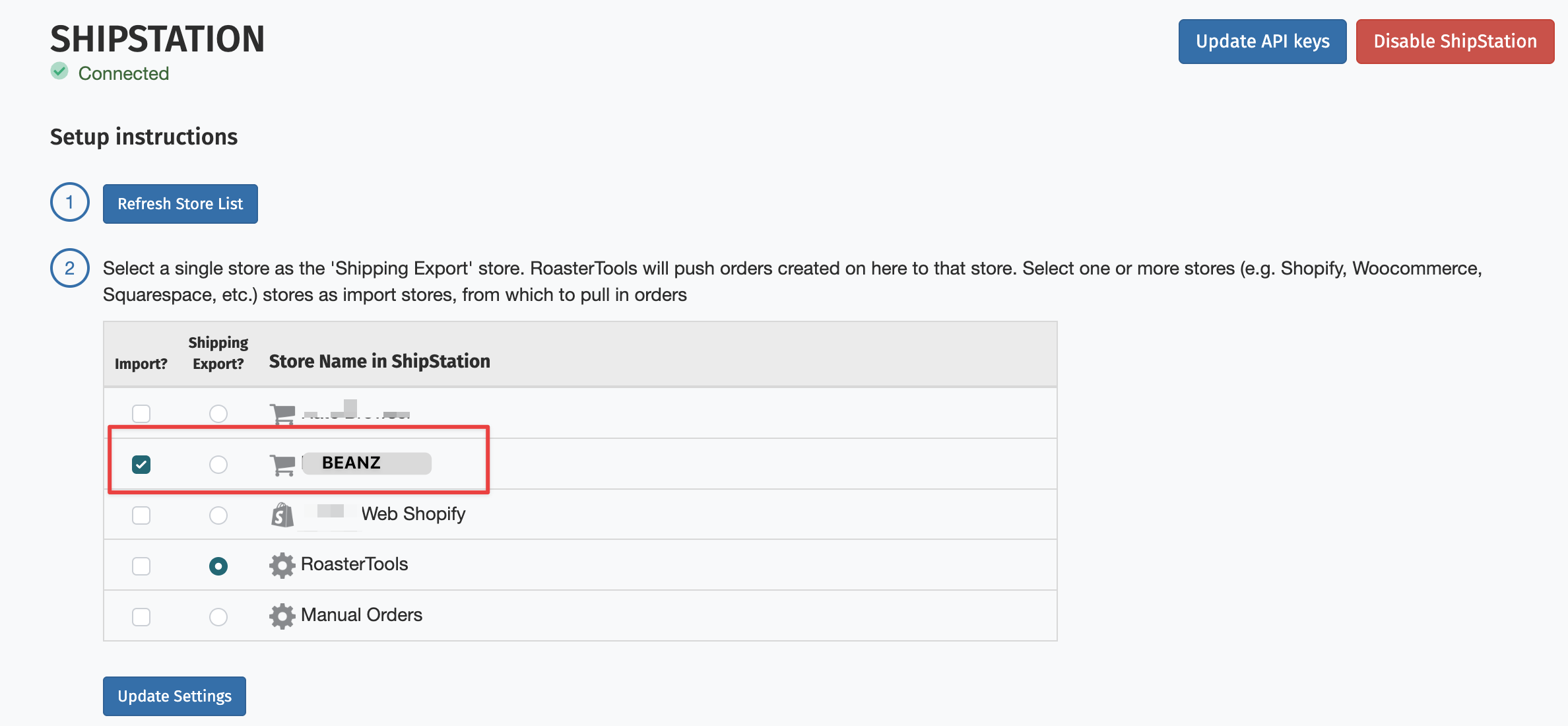 Once connected, RoasterTools will display a list of the stores in your ShipStation account.