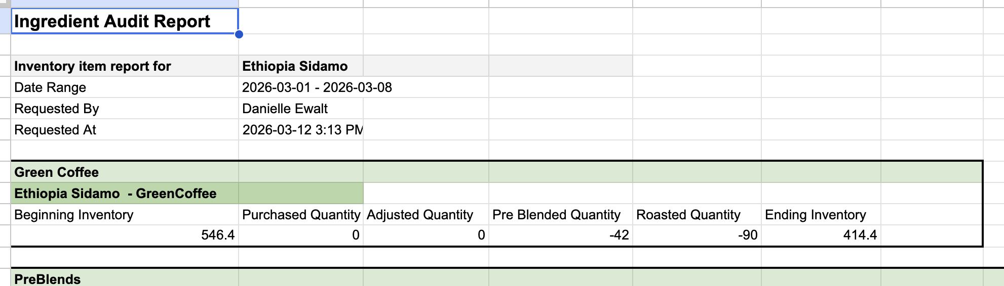 - Pre-Blend Quantity — Quantity consumed in Pre-Blend production. Shows as a negative number because this green coffee inventory decreases as it moves into Pre-Blend inventory.