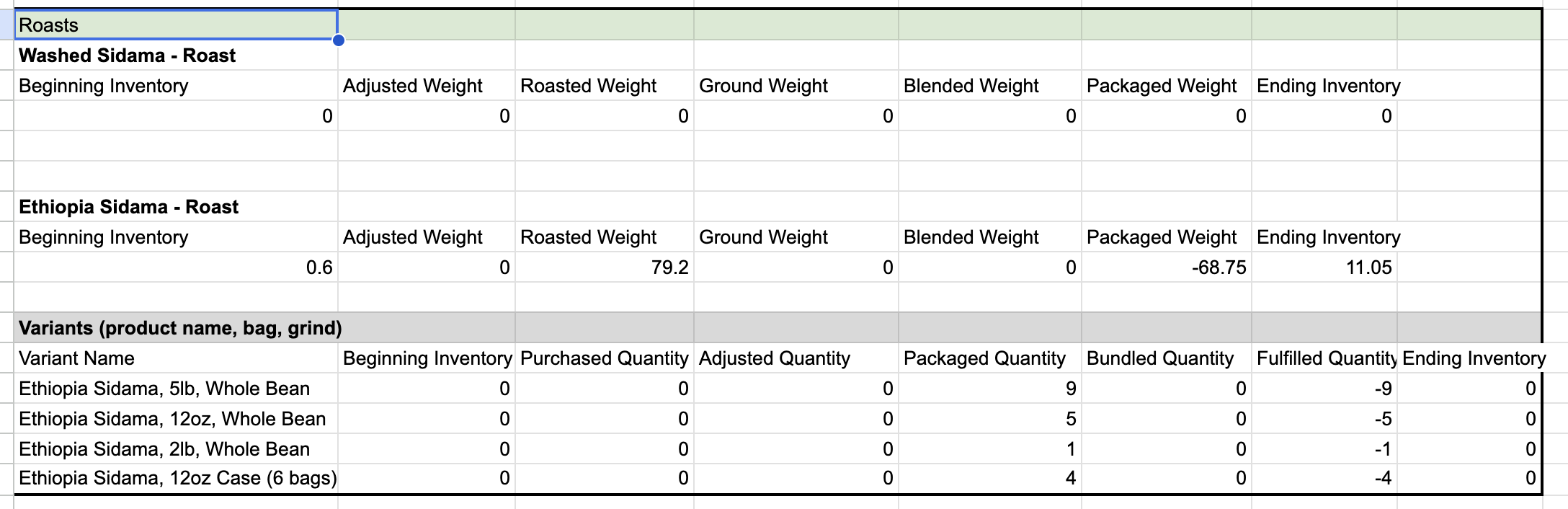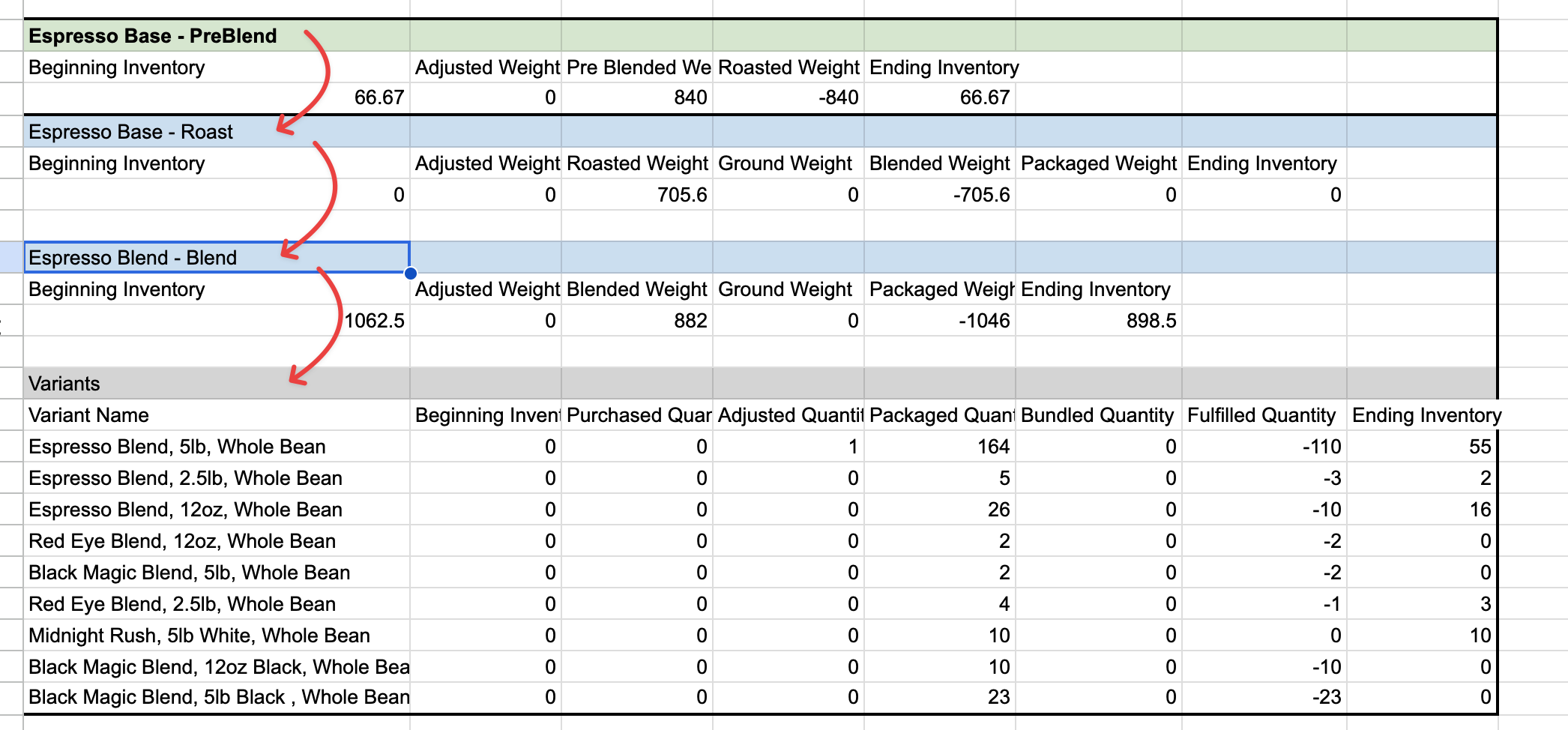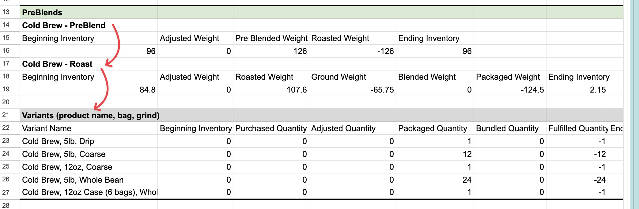 - Purchased Quantity - Disregard this column - it is for variants that have purchased inventory however coffee inventory is produced not purchased.