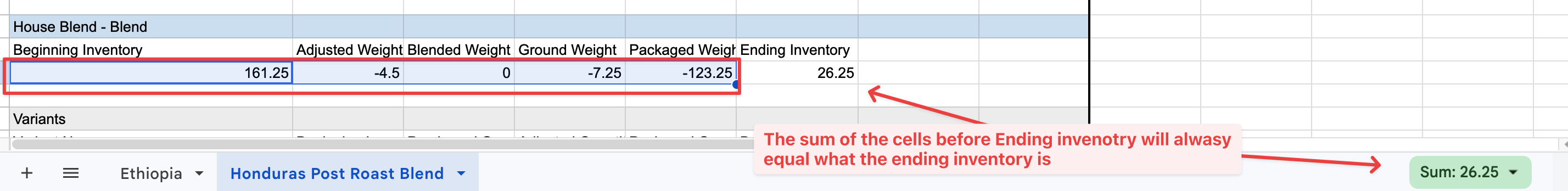 The math always checks out: Across every section, beginning inventory + all activity during the period (adjusted, Pre-Blend, roasted, ground, blended, etc.) = ending inventory.