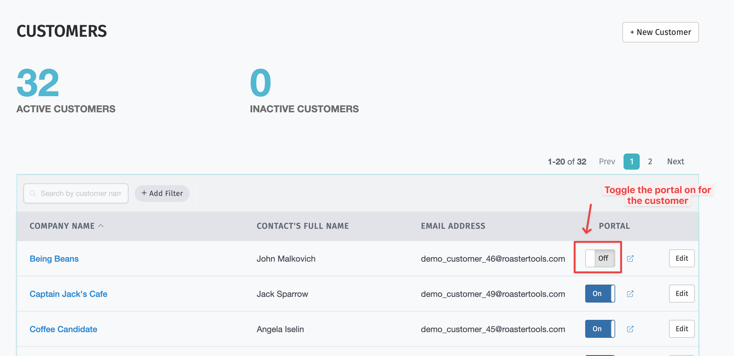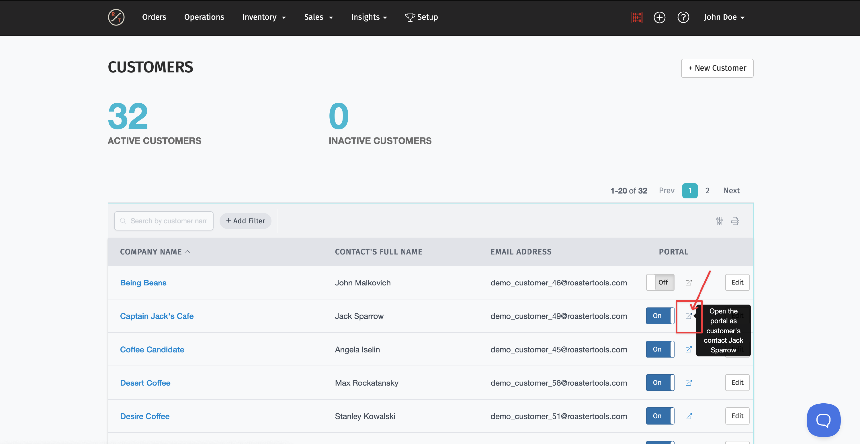 - If the portal isn't active for this customer, you will need to return to the customer list page and enable the portal for that customer before opening the portal.
