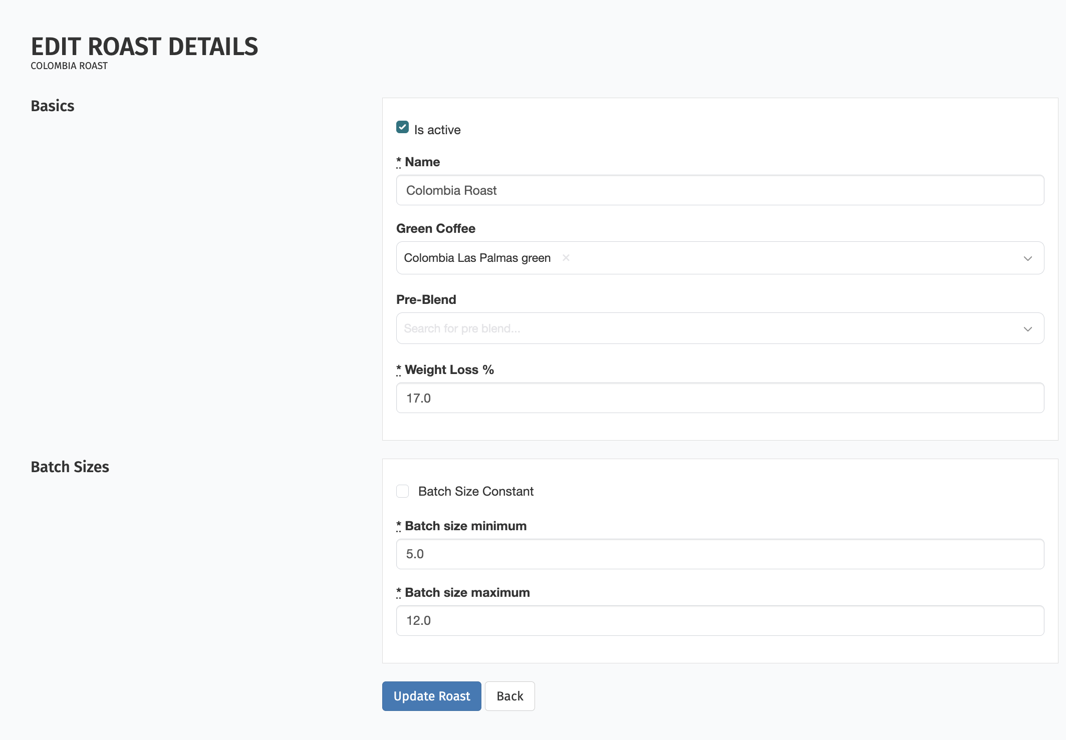 Once all incomplete tasks for that roast have been completed or deleted, you can return to the Edit Roast Details page and successfully update the ingredient.