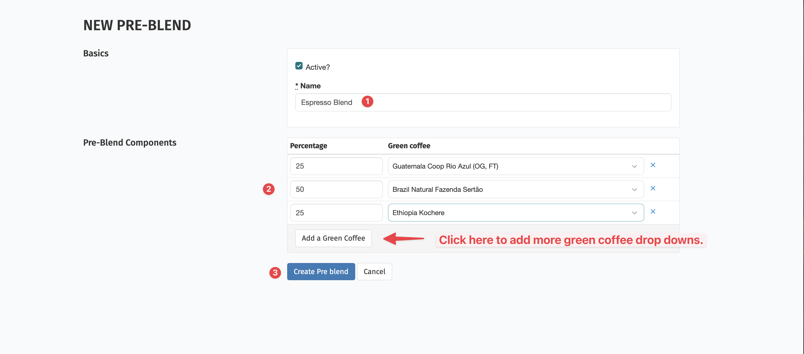 Note: If you want to apply tags to a pre-blend (for example, Organic or Fair Trade), all green coffees in the blend must meet that criteria.