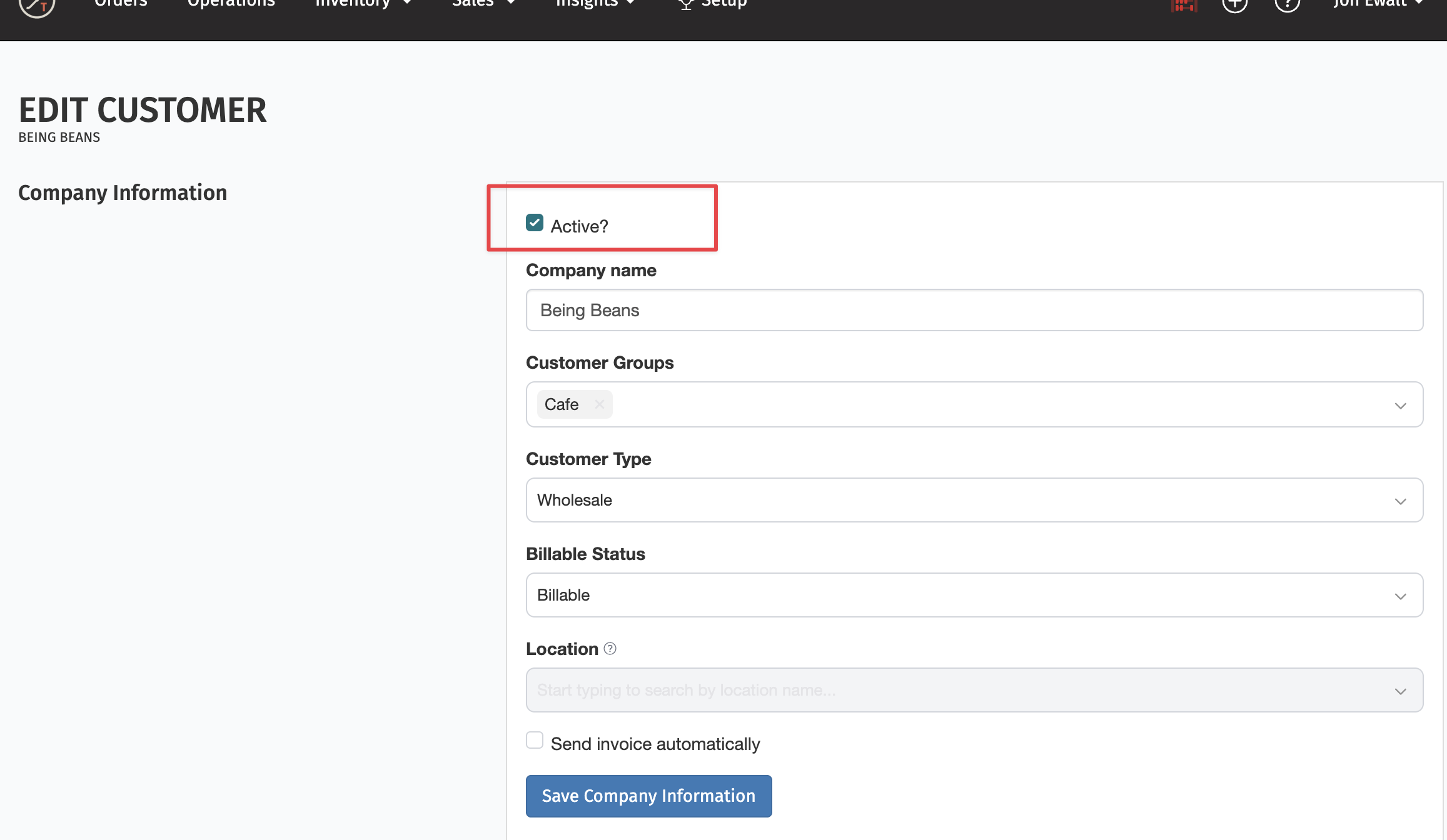 If you would like to deactivate a customer go to the customer edit page and select the Box at the top to Deactivate: