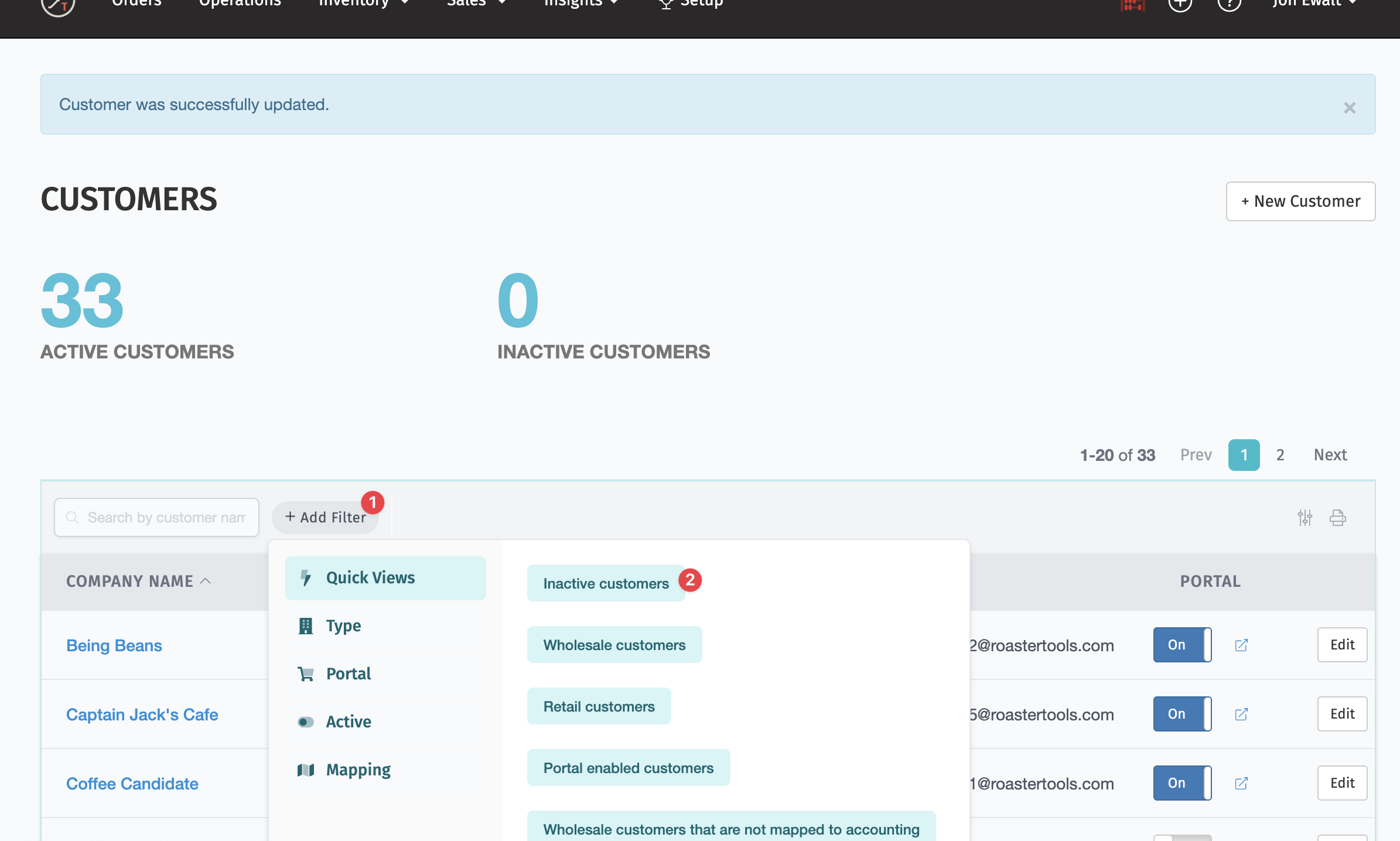The Customer View page defaults to showing active customers. To see inactive customers, select the filter and choose "Inactive customers"