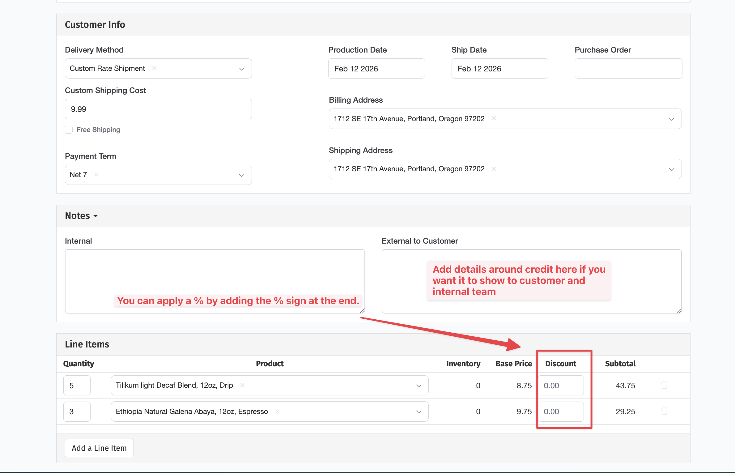 It's easy to apply a one-time discount to a wholesale order on RoasterTools:
