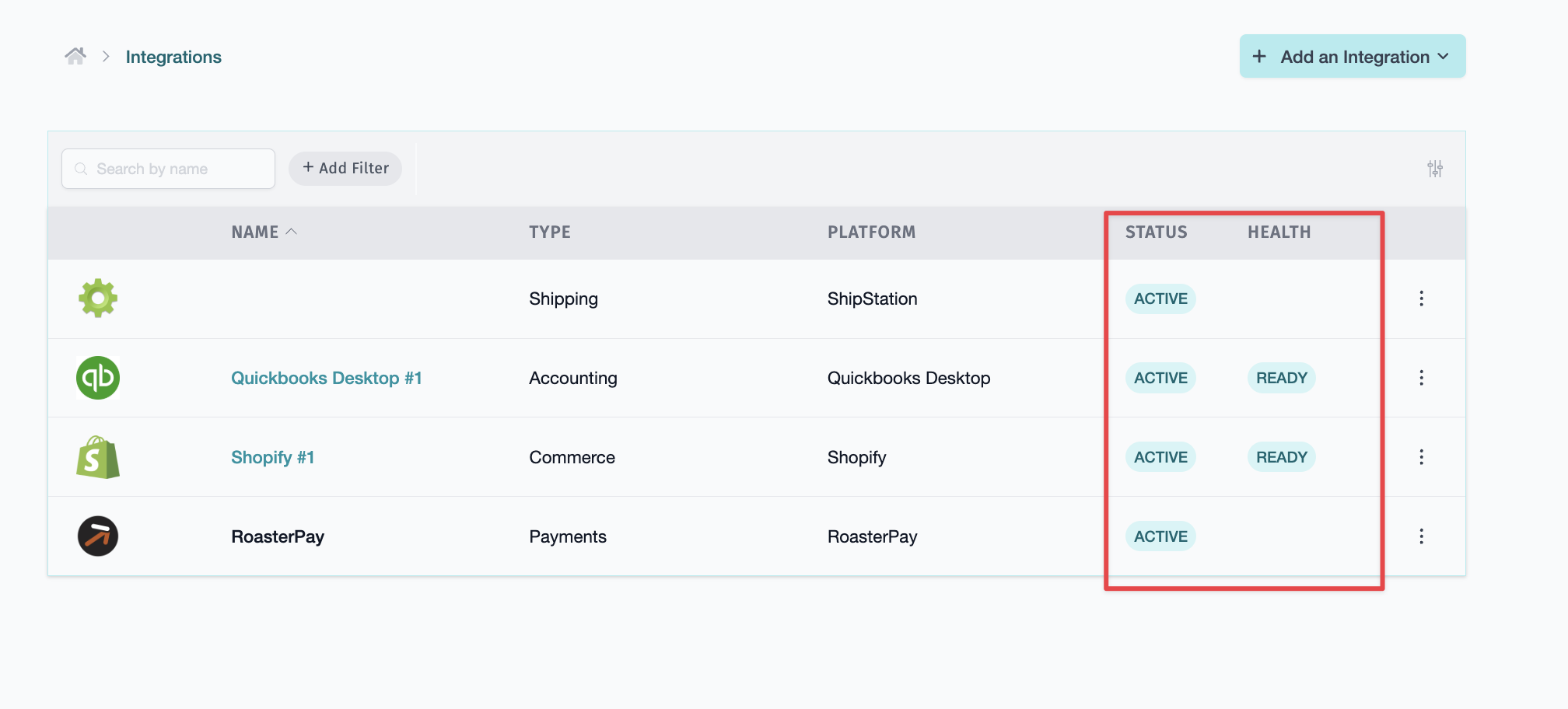 You can see the status and health of your Accounting connection on the Integrations Page